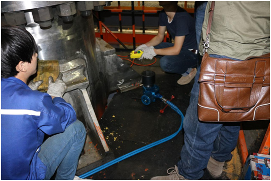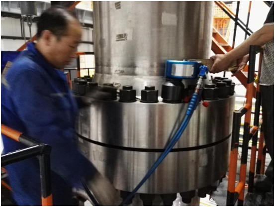 現(xiàn)場工作人員非常認(rèn)真地與波霆機械工程師進(jìn)行交流、探討以及學(xué)習(xí)液壓扳手的正確操作方法。培訓(xùn)剛剛結(jié)束大家就開始忙碌起來,對應(yīng)兩個法蘭現(xiàn)場工人分成兩組,每組三個人,采用兩同步拆卸螺栓。